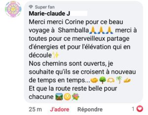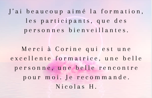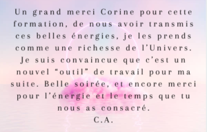 Bonjour Corine, après un mois et demi, il y beaucoup de changement en moi. Je me sens moins vulnérable et me sens de plus en plus reine dans mon temple. C’est à dire que j’ose plus facilement dire les choses quitte à créer du mécontentement chez l’autre afin de ne pas être impacté par la suite et me trouver dans une situation qui me déstabilise moi. La purification du lieu de vie est magnifique, ça fonctionne très très bien, et je pense que tous les habitants de cette maison ont évolué, mes plantes refleurissent. Je fais ma préparation chaque jour, sans me mettre la pression les jours où ça m’est compliqué de le faire et continue mes auto soins 2 fois par semaine ou quand je ressens le besoin. Concernant la pratique sur autrui, je l’ai fait sur mon fils et sur mon conjoint un fois pour les 2. Je n’ai pas encore osé demander à des cobayes (copines) mais ton message m’encourage à le faire.  Mélanie