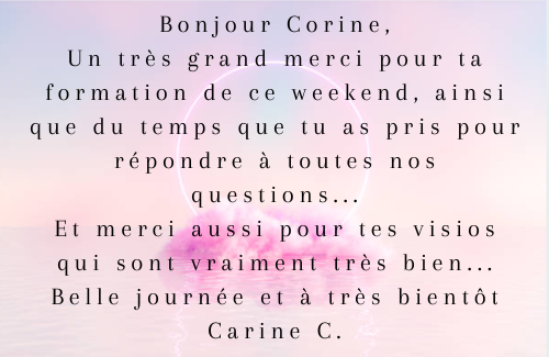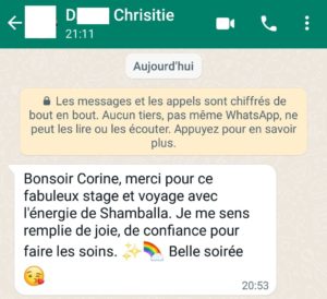 J’avais envie de te partager la sensation que j’ai eu quand tu as posée tes mains sur moi durant le soin pour montrer à C. . j’ai reçu un amour immense. C’était extraordinaire. J’ai jamais ressenti cela, alors merci. ça m’a profondément touchée.